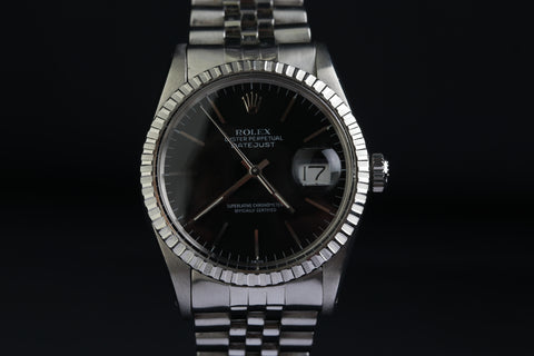 Sportlich elegante und wunderschöne Rolex Datejust im Original und mit seltenem schwarzem Ziffernblatt Schweiz 1984
